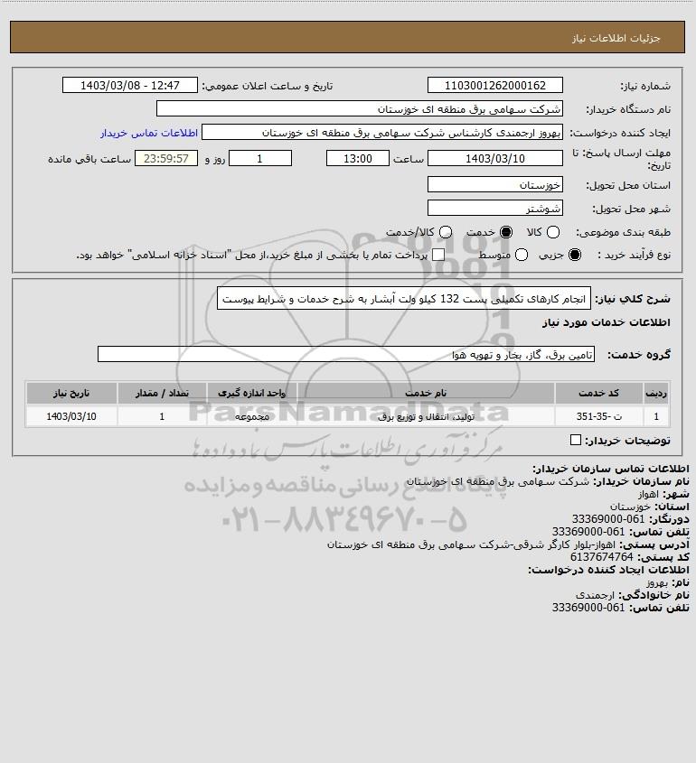 شرح کلی نیاز: انجام کارهای تکمیلی پست 132 کیلو ولت آبشار به شرح خدمات و شرایط پیوست