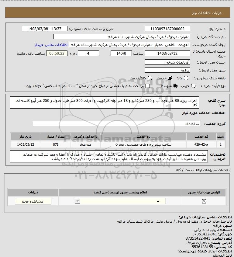 شرح کلی نیاز: اجرای پروژه 80 متر جوی آب و 230 متر کانیو و 18 متر لوله کارگوییت و اجرای 300 متر طول جدول و 250 متر آبرو کاسه ای که