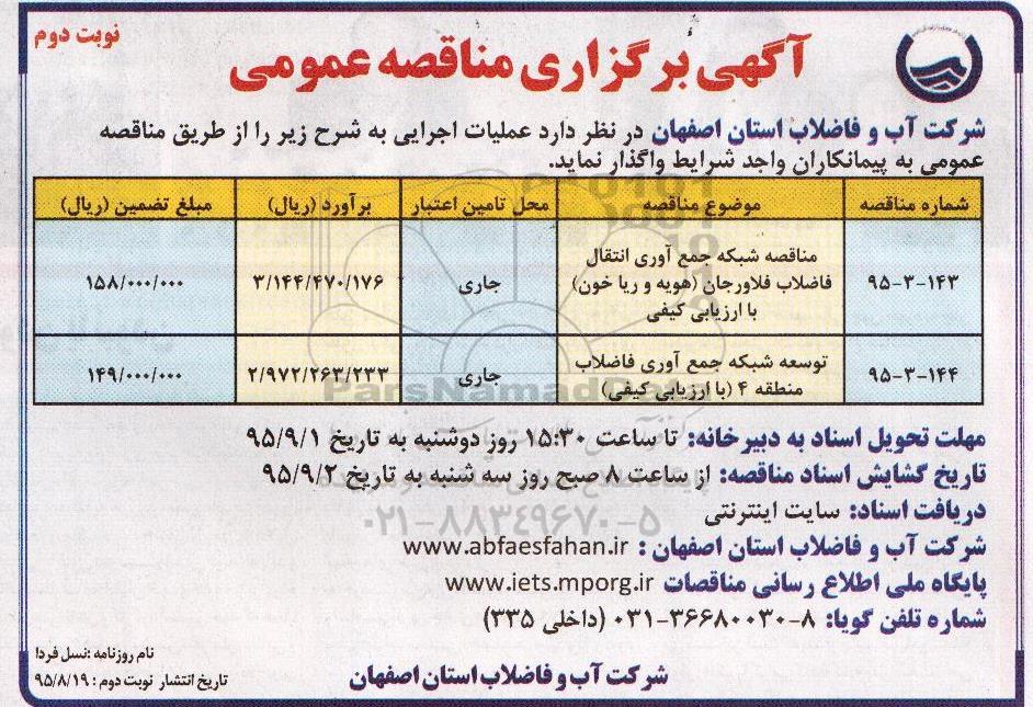 | 95-3-143 | مناقصه شبکه جمع آوری انتقال فاضلاب فلاورجان (هویه و ریا خون ) با ارزیابی کیفی |