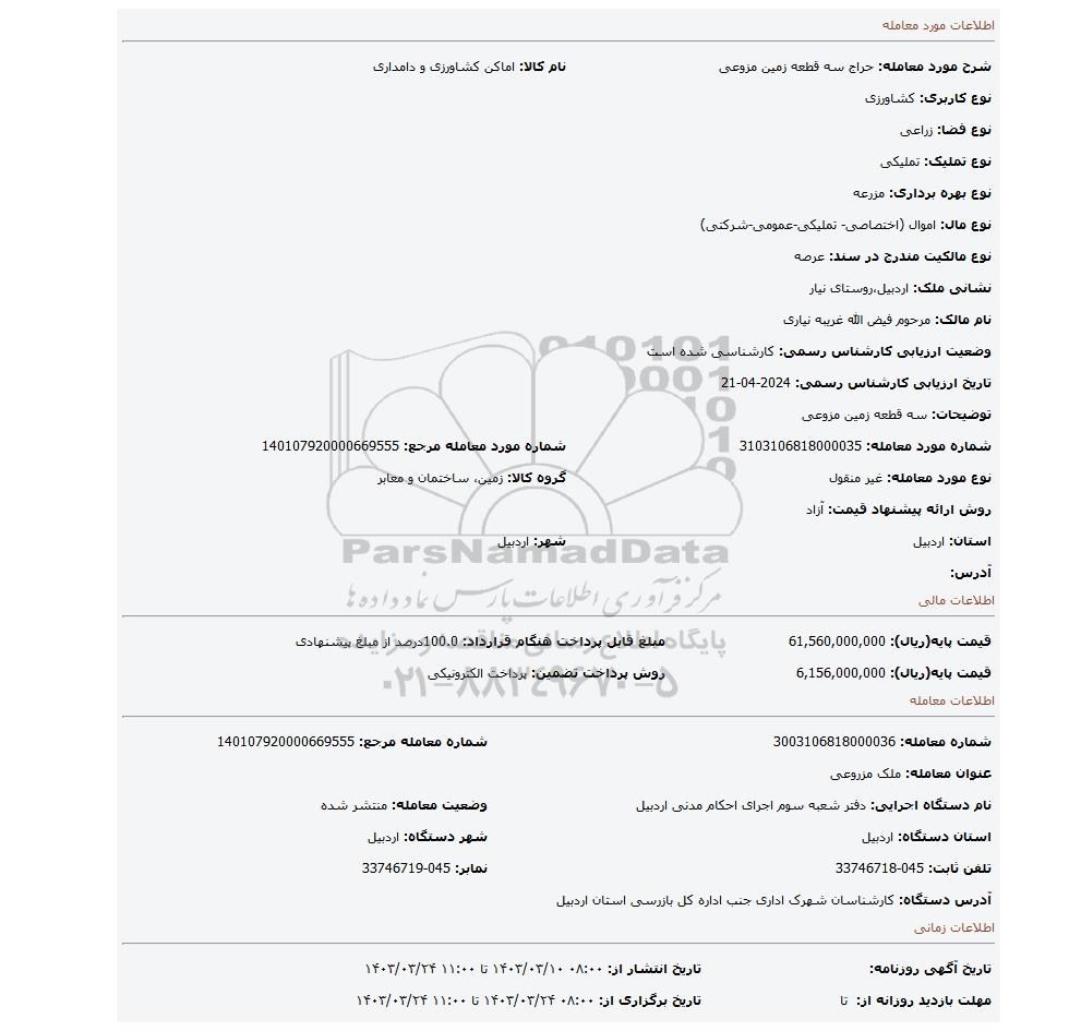 شرح مورد معامله: حراج سه قطعه زمین مزوعی | نام کالا: اماکن کشاورزی و دامداری | |