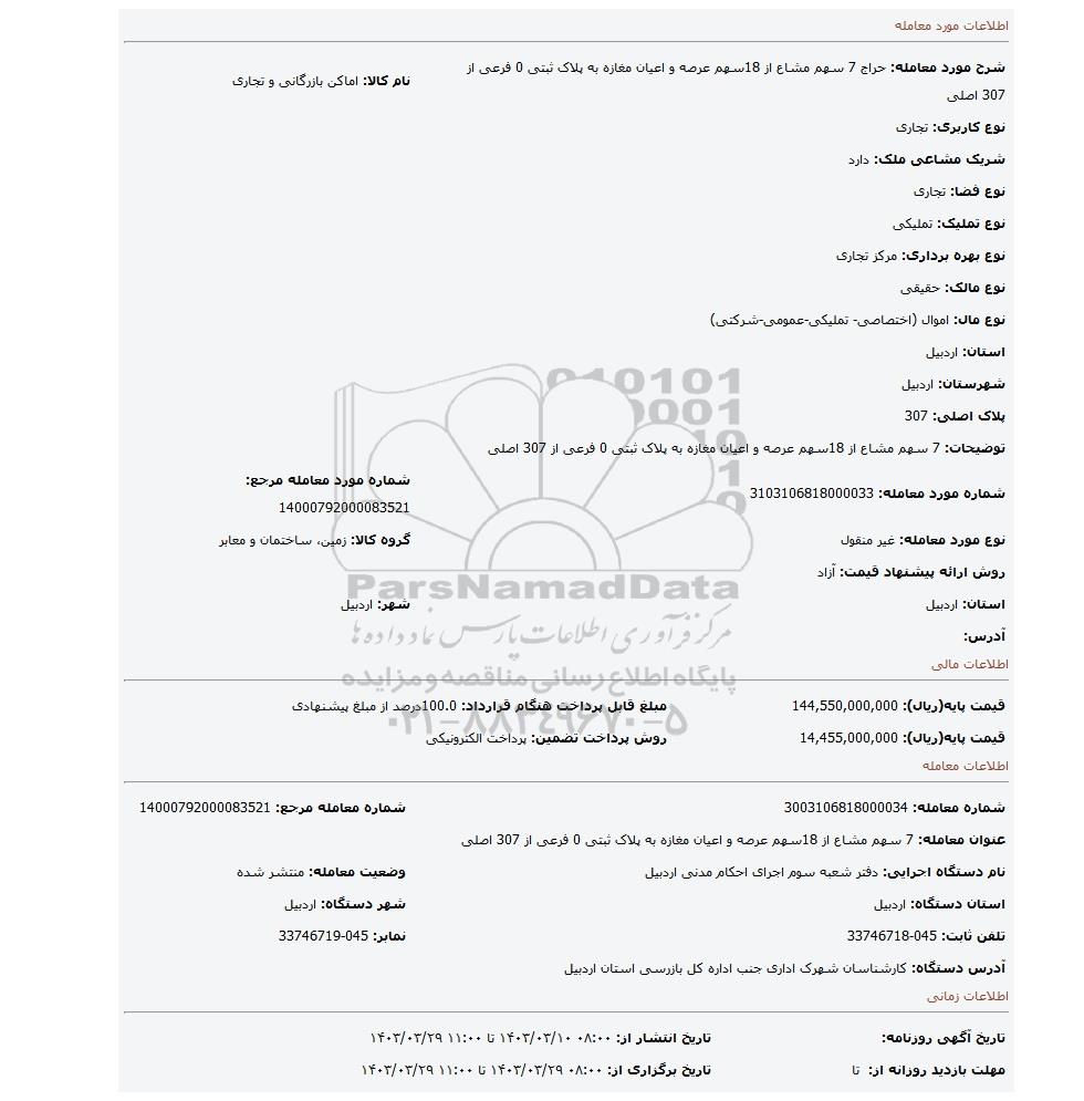 شرح مورد معامله: حراج 7 سهم مشاع از 18سهم عرصه و اعیان مغازه به پلاک ثبتی 0 فرعی از 307 اصلی نام کالا: اماکن بازرگانی و تجاری