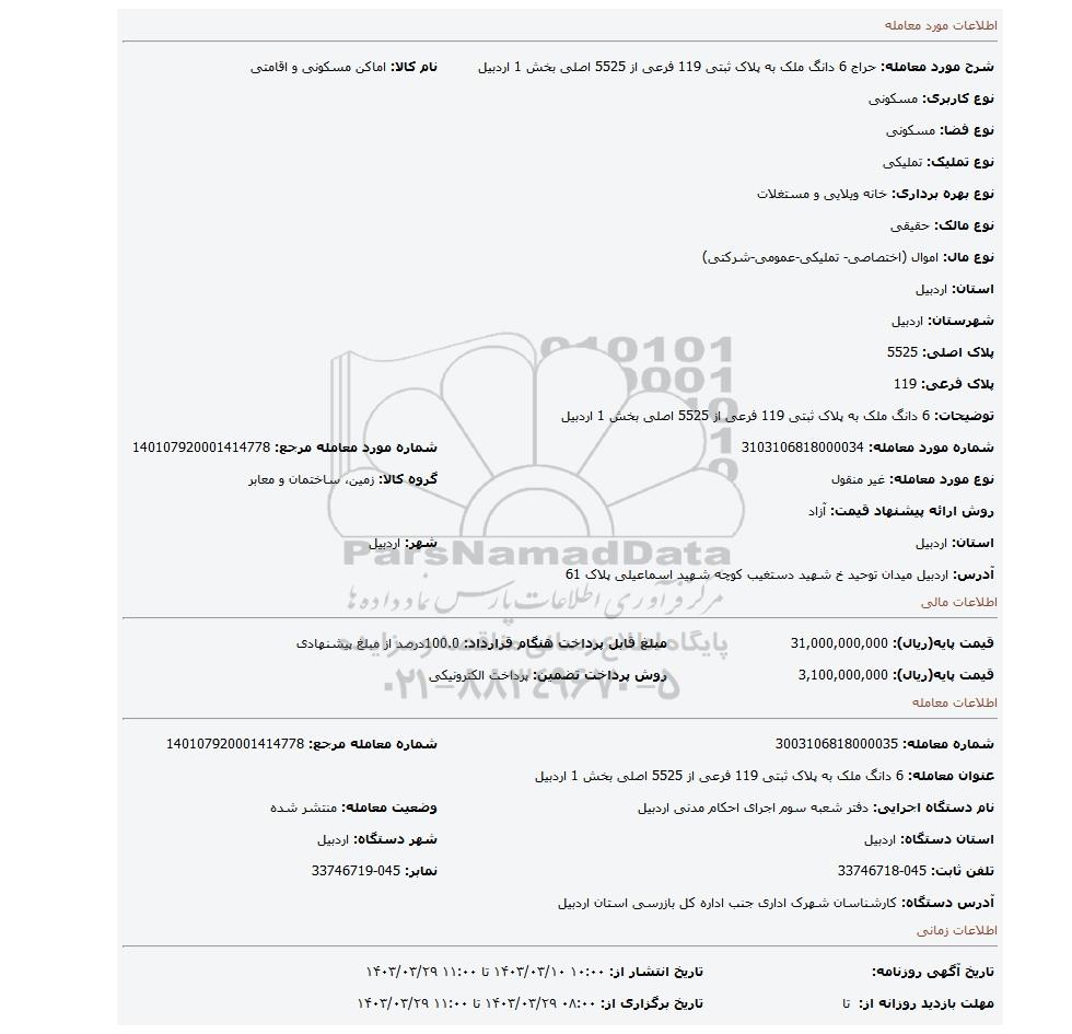 شرح مورد معامله: حراج 6 دانگ ملک به پلاک ثبتی 119 فرعی از 5525 اصلی بخش 1 اردبیل | نام کالا: اماکن مسکونی و اقامتی | |