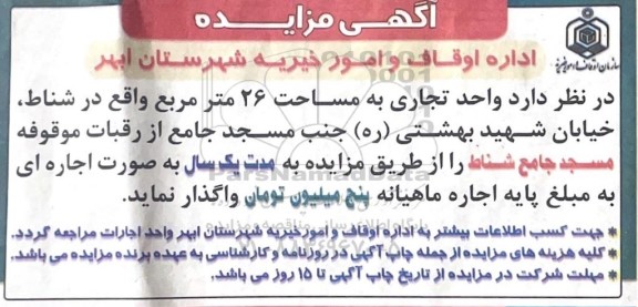در نظر دارد واحد تجاری به مساحت 26 متر مربع واقع در شناط، خیابان شهید بهشتی (ره) جنب مسجد جامع از رقبات موقوفه مسجد جامع شناط را از طریق مزایده به مدت یک سال به صورت اجاره ای به مبلغ پایه اجاره ماهیانه پنج میلیون تومان واگذار نماید.