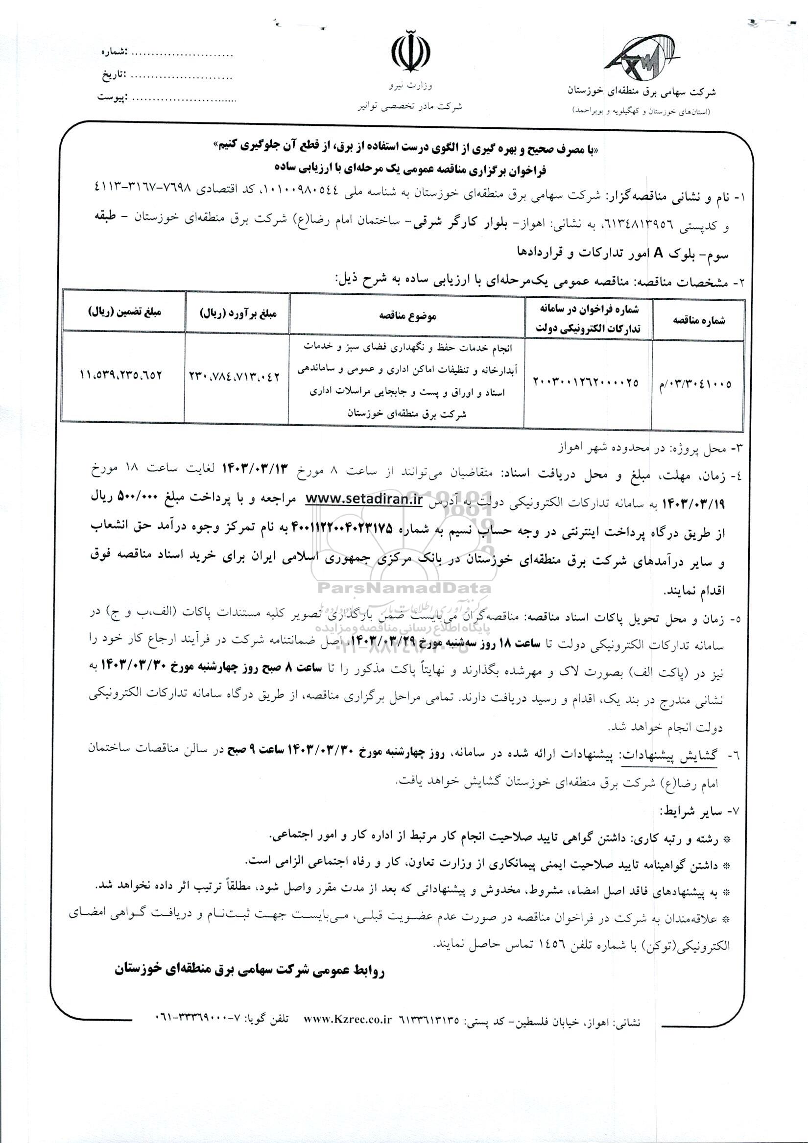 | 3041005/ 03./م | 2003001262000025 | انجام خدمات حفظ و نگهداری فضای سبز و خدمات آبدارخانه و تنظیفات اماکن اداری و عمومی و ساماندهی اسنادو اوراق و پست و جابجایی مراسلات اداری شرکت برق منطقه ای خوزستان | 230.784.713.042 | 11.539.235.652 |