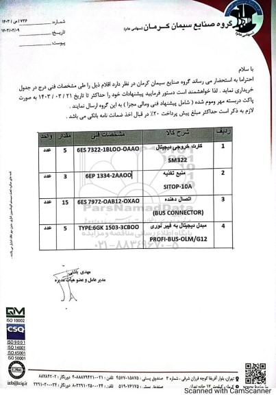 احتراما به استحضار میرساند گروه صنایع سیمان کرمان در نظر دارد اقلام ذیل را طبق مشخصات فنی درج در جدول ذیل خریداری نماید .