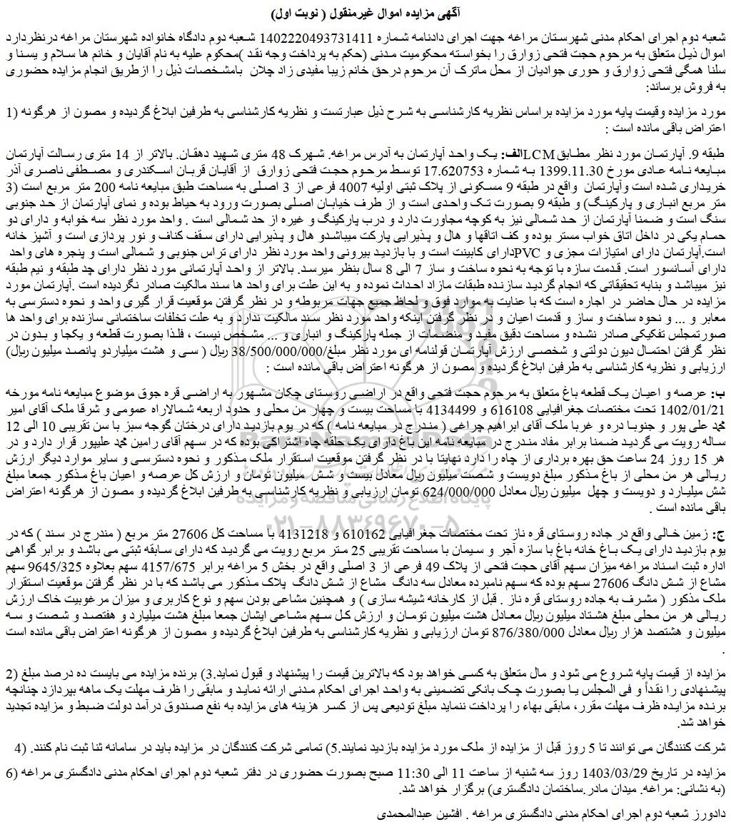 شعبه دوم اجرای احکام مدنی شهرستان مراغه جهت اجرای دادنامه شماره 1402220493731411 شعبه دوم دادگاه خانواده شهرستان مراغه درنظردارد اموال ذیل متعلق به مرحوم حجت فتحی زوارق را بخواسته محکومیت مدنی (حکم به پرداخت وجه نقد )محکوم علیه به نام آقایان و خانم ها سلام و یسنا و سلنا همگی فتحی زوارق و حوری جوادیان از محل ماترک آن مرحوم درحق خانم زیبا مفیدی زاد چلان بامشخصات ذیل را ازطریق انجام مزایده حضوری به فروش برساند: