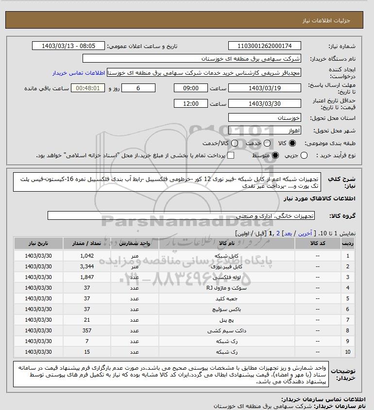 شرح کلی نیاز: تجهیزات شبکه اعم از کابل شبکه -فیبر نوری 12 کور -خرطومی فلکسیبل -رابط آب بندی فلکسیبل نمره 16-کیستون-فیس پلت تک پورت و... -پرداخت غیر نقدی