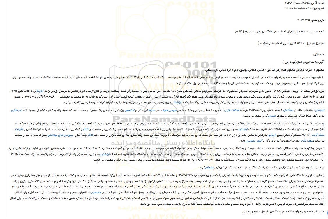شماره پرونده اجرایی0201181 شعبه اول اجرای احکام مدنی اردبیل به موجب درخواست دستور فروش ملک مشاع یک دستگاه اپارتمان موضوع پلاک ثبتی 19397 فرعی از 334799 اصلی مفروز و مجزی از 55 قطعه یک بخش ثبتی یک به مساحت 167/55 متر مربع و تقسیم بهائ آن بین شرکا اردبیل جهت ارزیابی و فروش جهت پرداخت محکوم به ، به کارشناسی ارجاع ونظریه کارشناسی به شرح ذیل اعلام می گردد.