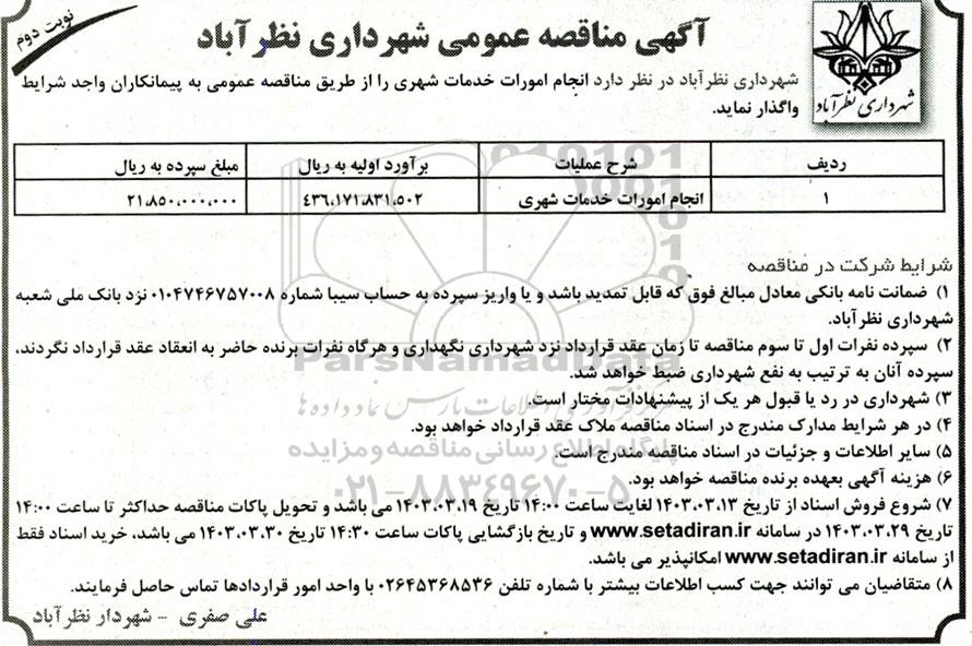 شهرداری نظرآباد در نظر دارد انجام امورات خدمات شهری را از طریق مناقصه عمومی به پیمانکاران واجد شرایط واگذار نماید