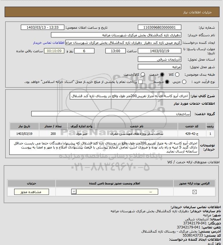 شرح کلی نیاز: اجرای آبرو کاسه ای به متراژ تقریبی200متر طول واقع در روستای تازه کند قشلاق
