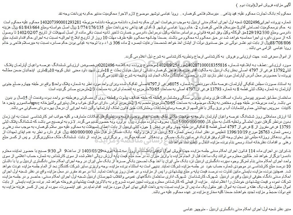 شماره پرونده اجرایی0202496 شعبه اول اجرای احکام مدنی اردبیل به موجب درخواست اجرای حکم به شماره دادنامه مربوطه دادنامه مربوطه 140207390001293281 محکوم علیه محکوم است به حکم برمحکومیت تضامنی آقای1-میرسلام فتاحی کوهساره 2- خانم رویا عباسی نوشهر 3-آقای محمد پناهی به پرداخت مبلغ 1/774/176/135 ریال اصل خواسته ومبلغ 61/843/664 ریال هزینه دادرسی ومبلغ 129/192/330حق الوکاله وکیل وفق تعرفه قانونی و براساس مداخله وکیل درمراحل دادرسی و خسارت تاخیر تادیه نسبت باقی مانده از اصل تسهیلات از تاریخ 1402/02/07 تا وصول که از سوی دایره ی اجرا محاسبه خواهد شد در حق محکوم له محکوم می باشند .ضمنا چنانچه محکوم علیه ظرف مهلت 10 روز از تاریخ ابلاغ اجرائیه نسبت به اجرای حکم اقدام ننماید مبلغ 88/708/806ریال از بابت نیم عشر دولتی در حق صندوق دولت از ایشان اخذ خواهد شدضمنا رعایت تبصره 2 ماده 306 ق ا د م با توجه به غیابی بودن حکم صادره نسبت به میرسلام فتاحی و خانم رویا عباسی الزامی می باشد .