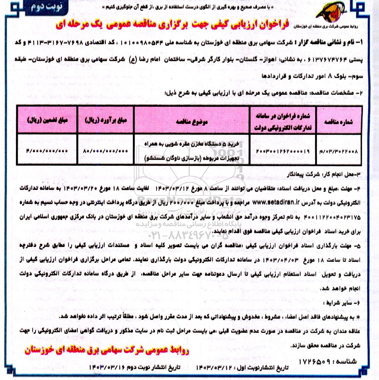 1- نام و نشانی مناقصه گزار شرکت سهامی برق منطقه ای خوزستان به شناسه ملی 10100980544 کد اقتصادی 7698-3167-4113 و کد پستی 6137674764 به نشانی: اهواز - گلستان - بلوار کارگر شرقی ساختمان 8 طبقه شرکت برق منطقه ای خوزستان طبقه سوم امور بلوک a امور تدارکات و قراردادها