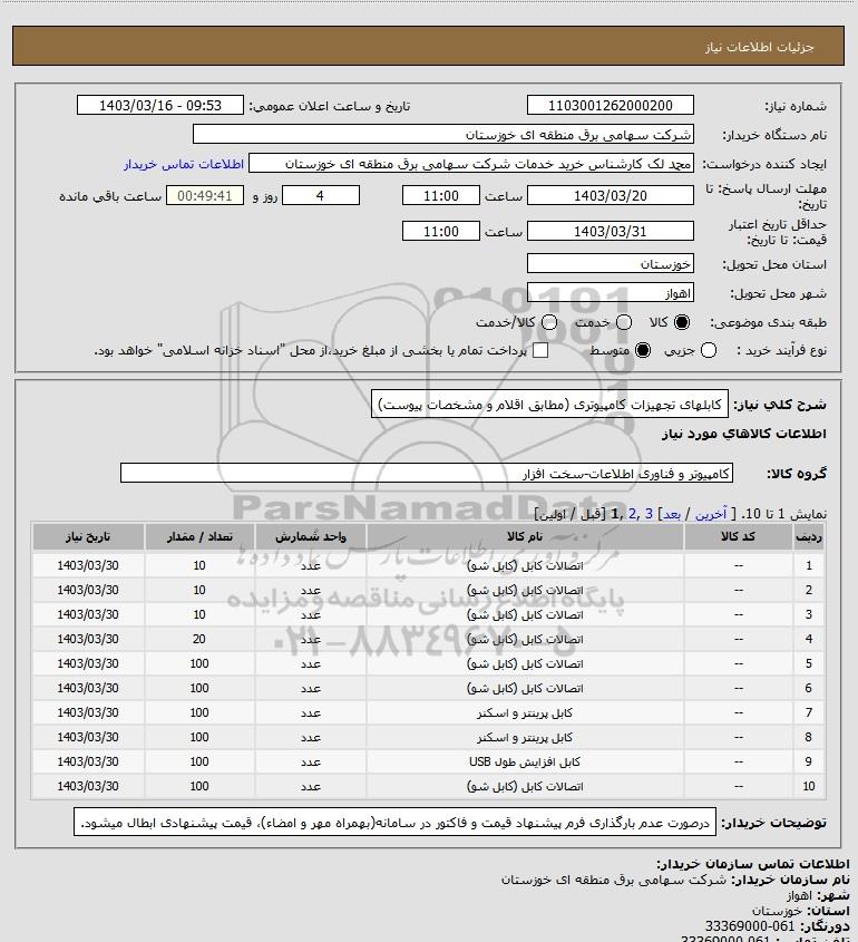 شرح کلی نیاز: کابلهای تجهیزات کامپیوتری (مطابق اقلام و مشخصات پیوست)