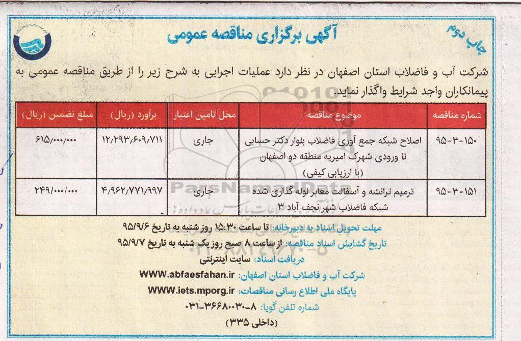 شرکت آب و فاضلاب استان اصفهان در نظر دارد عملیات اجرایی به شرح زیر را از طریق مناقصه عمومی به پیمانکاران واجد شرایط واگذار نماید .