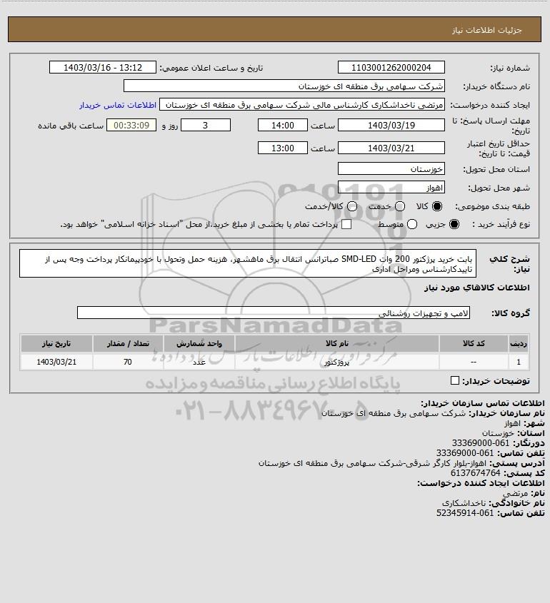 شرح کلی نیاز: بابت خرید پرژکتور 200 وات SMD-LED صباترانس انتقال برق ماهشهر، هزینه حمل وتحول با خودپیمانکار پرداخت وجه پس از تاییدکارشناس ومراحل اداری