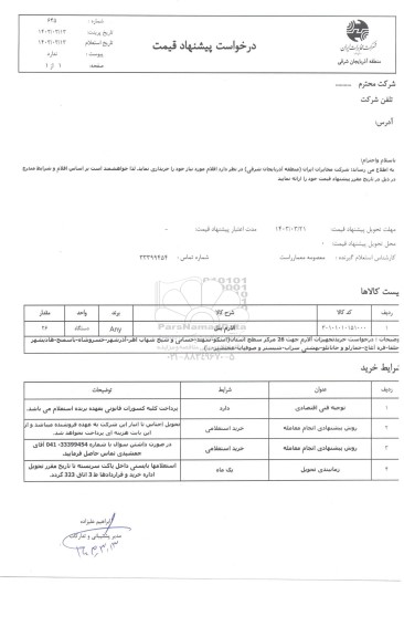شرکت مخابرات ایران (منطقه آذربایجان شرقی) به اطلاع می رساند شرکت مخابرات ایران (منطقه آذربایجان شری) در نظر دارد اقلام مورد نیاز خود را خریداری نماید لذا خواهشمند است براساس اقلام و شرایط مندرج در ذیل در تاریخ مقرر پیشنهاد قیمت خودرا ارائه نمایید.