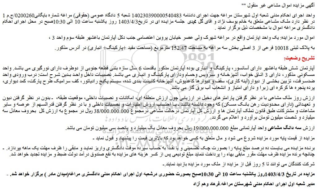 - مزایده در تاریخ 1403/4/3روز یکشنبه ساعت 10 الی 10:30صبح بصورت حضوری درشعبه اول اجرای احکام مدنی دادگستری مراغه(میدان مادر ) برگزار خواهد شد.