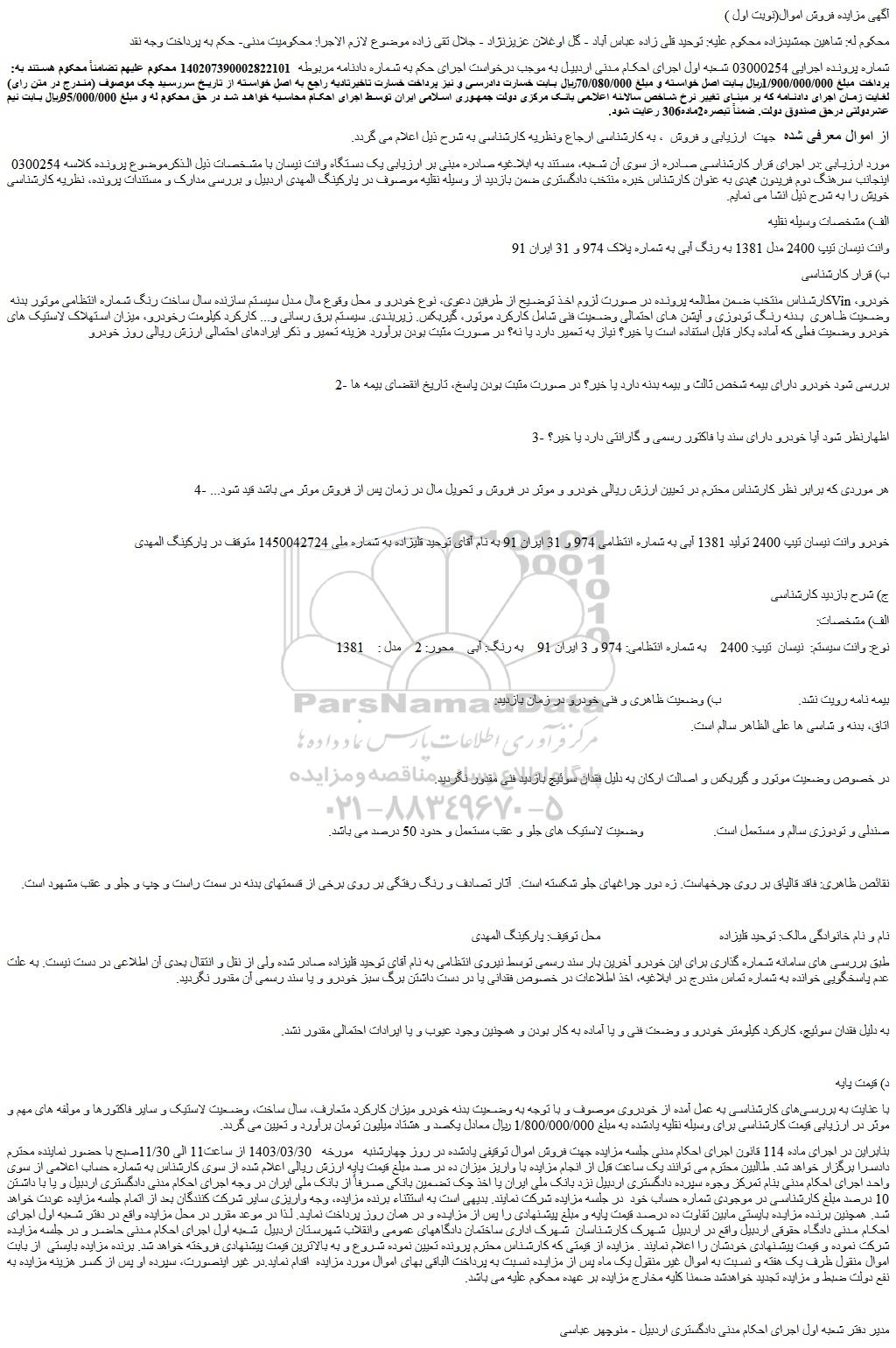 مورد ارزیابی :در اجرای قرار کارشناسی صادره از سوی آن شعبه، مستند به ابلاغیه صادره مبنی بر ارزیابی یک دستگاه وانت نیسان با مشخصات ذیل الذکرموضوع پرونده کلاسه 0300254 اینجانب سرهنگ دوم فریدون محمدی به عنوان کارشناس خبره منتخب دادگستری ضمن بازدید از وسیله نقلیه موصوف در پارکینگ المهدی اردبیل و بررسی مدارک و مستندات پرونده، نظریه کارشناسی خویش را به شرح ذیل انشا می نمایم.