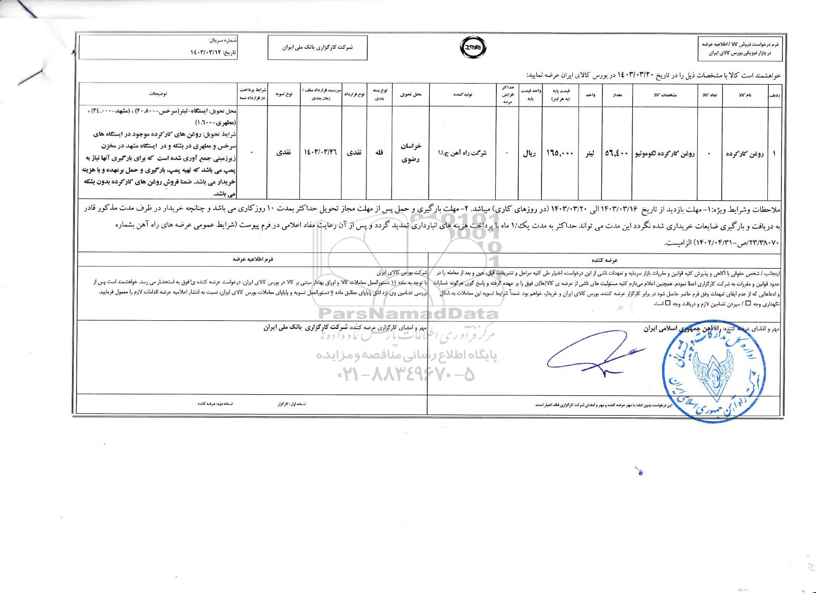 توضیحات: محل تحویل: ایستگاه، لیتر (سرخس 800-20 (مشهد 34.000 (مطهری 1.600)