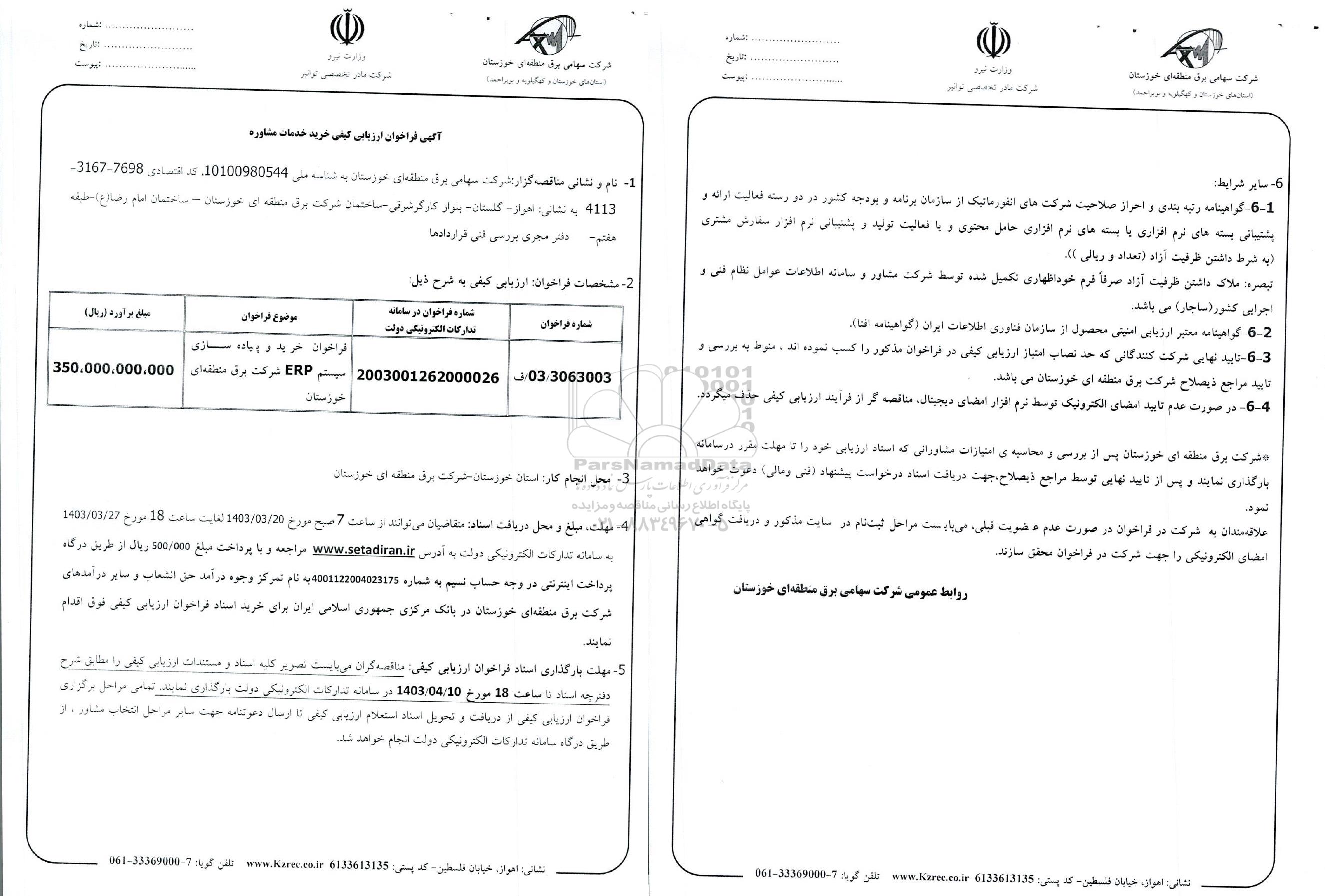 | 03/3063003/ف | 2003001262000026 | فراخوان خرید و پیاده سازی سیستم ERP شرکت برق منطقه ای خوزستان | 350.000.000.000 |
