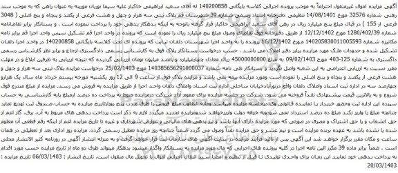 متن آگهی: آگهی مزایده اموال غیرمنقول احتراماً به موجب پرونده اجرائی کلاسه بایگانی 140200858 له آقای سعید ابراهیمی خاکباز علیه سیما نوریان مورینه به عنوان راهن که به موجب سند رهنی شماره 32576 مورخ 14/08/1401 تنظیمی دفترخانه اسناد رسمی شماره 39 شهرستان قم پلاک ثبتی سه هزار و چهل و هشت فرعی از یکصد و پنجاه و پنج اصلی ( 3048 فرعی از 155 ) در قبال مبلغ پنج میلیارد ریال در رهن آقای سعید ابراهیمی خاکباز قرار گرفته باتوجه به اینکه بدهکار بدهی خود را پرداخت ننموده است . و بستانکار برابر تقاضانامه شماره 1280/402/39 مورخ 12/12/1402 از طریق دفترخانه فوق تقاضای وصول مبلغ پنج میلیارد ریال را نموده است که پرونده در واحد اجرا قم تشکیل سپس واحد اجرا قم برابر نامه مکانیزه شماره 140205830011005593 مورخ 16/12/1402 پرونده را به واحد اجرا شهرستان دلفان نیابت که پرونده ای تحت کلاسه بایگانی 140200858 در واحد اجرا دلفان تشکیل شده و حدودات ملک مورد مزایده برابر دفتر املاک می باشد ، حسب درخواست بستانکار پلاک فوق به کارشناس رسمی دادگستری ارجاع و برابر نظر کارشناس رسمی داگستری به شماره 125-403 مورخ 09/02/1403 به مبلغ 45000000000 ریال معادل چهارمیلیارد و پانصد میلیون تومان ارزیابی گردیده که نتیجه ارزیابی به طرفین ابلاغ و در مهلت مقرر نسبت به ارزیابی اعتراضی به این شعبه واصل نگردید و بستانکار طی نامه شماره 140385656291000037 مورخ 25/02/1403 درخواست مزایده پلاک ثبتی سه هزار و چهل و هشت فرعی از یکصد و پنجاه و پنج اصلی را نموده است ومورد مزایده بیمه نمی باشد و مزایده پلاک فوق از ساعت 9 الی 12 روز یکشنبه مورخه بیستم خرداد ماه سال یک هزارو چهارصد سه در اداره ثبت اسناد واملاک دلفان واقع درنورآبادخیابان ساحلی اداره ثبت اسناد واملاک دلفان واحد اجرا از طریق مزایده به فروش می رسد. مزایده از مبلغ مندرج فوق شروع و به بالاترین قیمت پیشنهادی نقداً فروخته می شود. شرکت در جلسه مزایده برای عموم آزاد شرکت درمزایده منوط به پرداخت ده درصد ازمبلغ پایه کارشناسی به حساب سپرده این اداره ثبت وحضور خریدار یا نماینده قانونی وی درجلسه مزایده میباشد ومابه التفاوت مبلغ فروش را ظرف مدت پنج روزازتاریخ مزایده به حساب صندوق ثبت تودیع نماید چنانچه مبلغ را واریز نکند مبلغ ده درصد استرداد نمی شودوبه خزانه دولت واریزخواهد شدومزایده تجدید میگردد لازم به ذکر است پرداخت بدهی های مربوط به آب، برق، گاز اعم از حق انشعاب و یا حق اشتراک و مصرف در صورتی که مورد مزایده دارای آنها باشد و نیز بدهی های مالیاتی و عوارض شهرداری و غیره تا تاریخ مزایده اعم از اینکه رقم قطعی آن معلوم شده یا نشده باشد به عهده برنده مزایده است و نیم عشر و حق مزایده نقداً وصول می گردد ضمناً چنانچه روز مزایده تعطیل رسمی گردد، مزایده روز اداری بعد از تعطیلی در همان ساعت و مکان مقرر برگزار خواهد شد این آگهی پس از تائید فرآیند مزایده در سایت آگهی های سازمان ثبت قرار خواهد گرفت و به منزله انتشار آگهی در روزنامه کثیر الانتشار محلی است . ضمناً برابر ماده 39 مکرر ائین نامه اجرا در کلیه پرونده های اجرایی که مال مورد مزایده به بستانکار واگذار میشود بدهکار میتواند ظرف دو ماه از تاریخ مزایده حسب مورد اقدام به پرداخت بدهی خود نمایند این زمان برای واحدی تولیدی تا قبل از تنظیم و امضا سند انتقال اجرایی اموال یا تحویل مال منقول است. تاریخ انتشار : 06/03/1403 تاریخ مزایده : 20/03/1403
