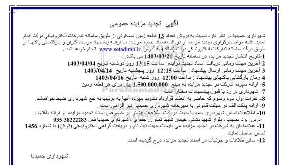 شهرداری حمیدیا در نظر دارد نسبت به فروش تعداد 13 قطعه زمین مسکونی از طریق سامانه تدارکات الکترونیکی دولت اقدام نماید. کلیه مراحل برگزاری مزایده از دریافت اسناد مزایده تا ارائه پیشنهاد مزایده گران و بازگشایی پاکتها از طریق درگاه سامانه تدارکات الکترونیکی دولت (ستاد) به آدرس ستاد ایران انجام خواهد شد