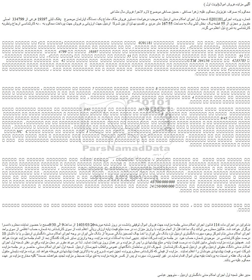 شماره پرونده اجرایی0201181 شعبه اول اجرای احکام مدنی اردبیل به موجب درخواست دستور فروش ملک مشاع یک دستگاه اپارتمان موضوع پلاک ثبتی 19397 فرعی از 334799 اصلی مفروز و مجزی از 55 قطعه یک بخش ثبتی یک به مساحت 167/55 متر مربع و تقسیم بهائ آن بین شرکا اردبیل جهت ارزیابی و فروش جهت پرداخت محکوم به ، به کارشناسی ارجاع ونظریه کارشناسی به شرح ذیل اعلام می گردد.