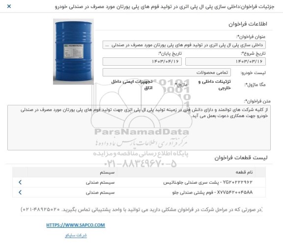 از کلیه شرکت های توانمند و دارای دانش فنی در زمینه تولید پلی ال پلی اتری جهت تولید فوم های پلی یورتان مورد مصرف در صندلی خودرو چهت همکاری دعوت بعمل می آید