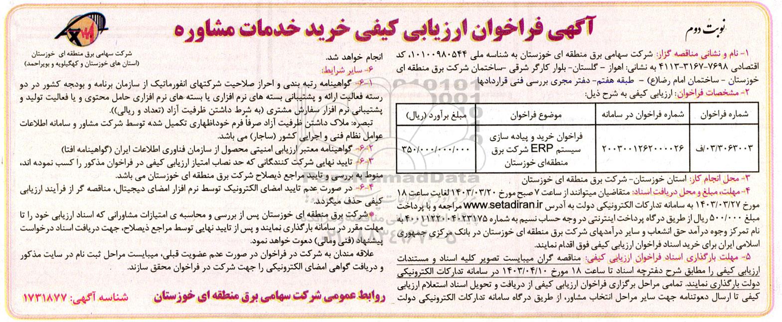 | 03/3063003/ف | 2003001262000026 | فراخوان خرید و پیاده سازی سیستم ERP شرکت برق منطقه ای خوزستان | 350.000.000.000 |
