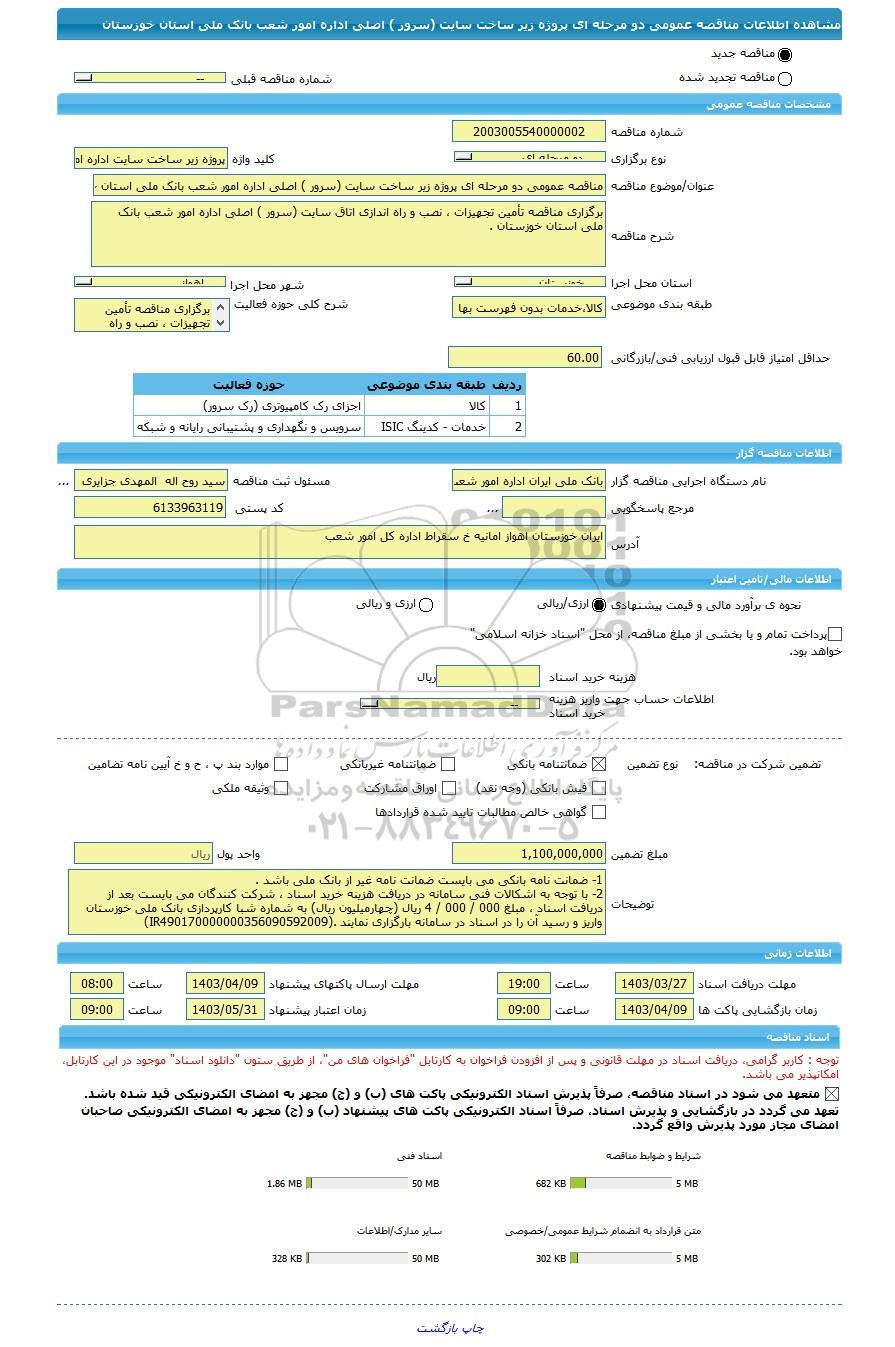 | عنوان/موضوع مناقصه | مناقصه عمومی دو مرحله ای پروژه زیر ساخت سایت (سرور ) اصلی اداره امور شعب بانک ملی استان خوزستان | |||||||||||
