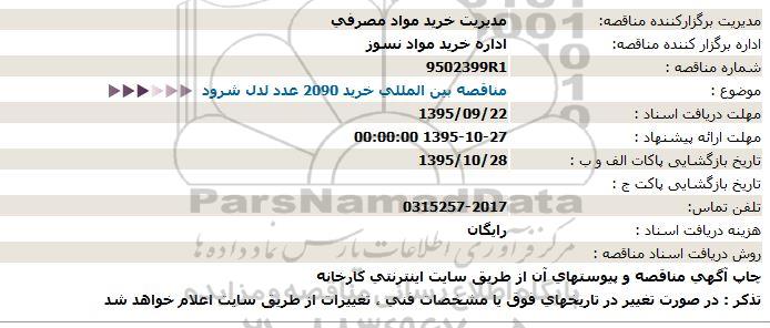مناقصه بین المللی خرید 2090 عدد لدل شرود از کلیه افراد متخصص و شرکت‌ها واجد شرایط دعوت به عمل می‌آید در مناقصه با کد خبرگزاری پارس نماد: 757944 شرکت نمایند. این مناقصه در تاریخ 1395/09/02 شروع و مهلت آن تا تاریخ 1395/09/22 میباشد.