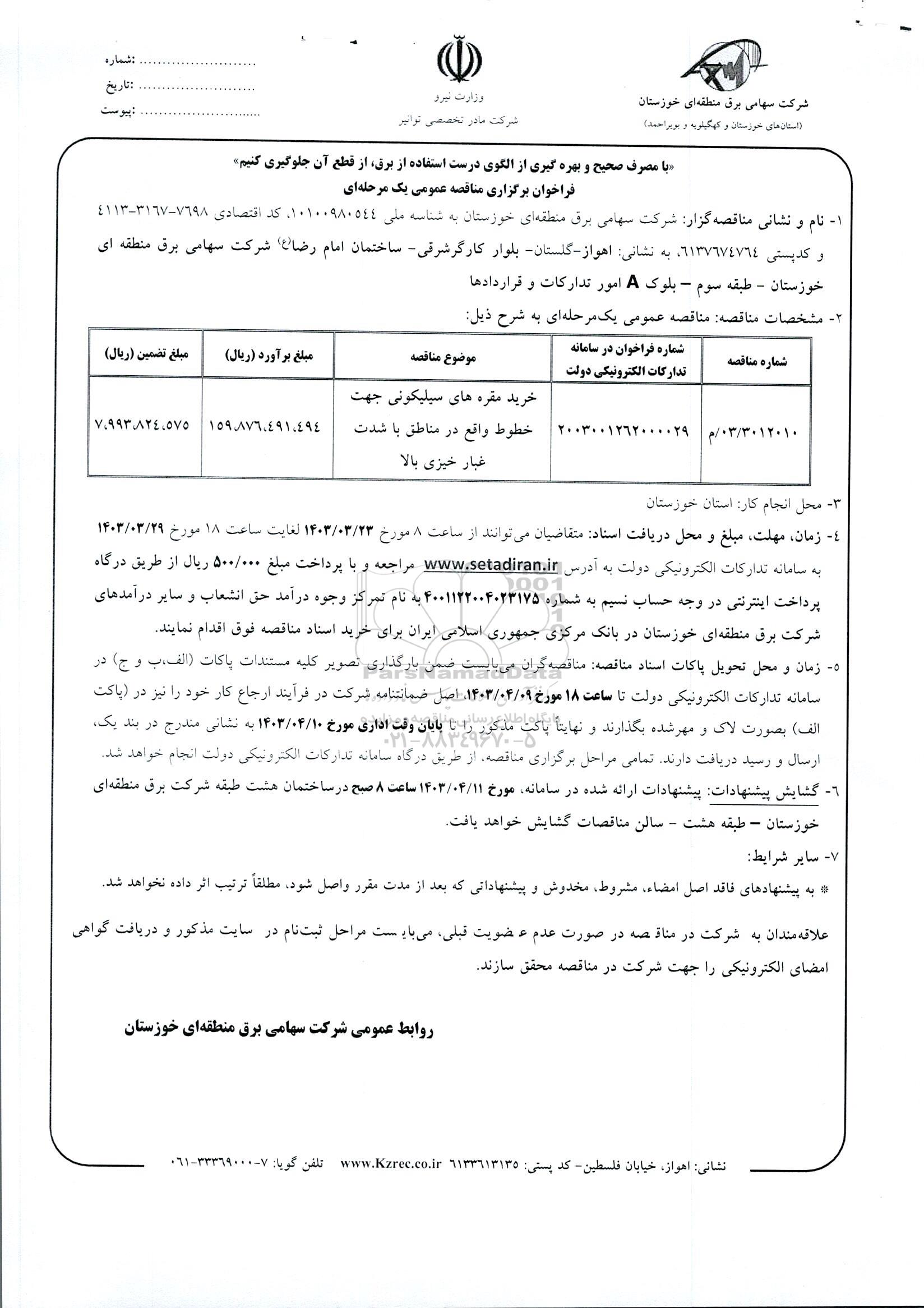 1- نام و نشانی مناقصه گزار شرکت سهامی برق منطقه ای خوزستان به شناسه ملی 10100980544 کد اقتصادی 7698-3167-4113 و کد پستی 6137674764 به نشانی: اهواز - گلستان - بلوار کارگر شرقی ساختمان 8 طبقه شرکت برق منطقه ای خوزستان طبقه سوم امور بلوک a امور تدارکات و قراردادها