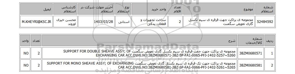 استعلام، مجموعه ی براکت جهت قرقره ی سیم بکسل گاری تعویض سگمنت, استعلام، مجموعه ی براکت جهت قرقره ی سیم بکسل گاری تعویض سگمنت
