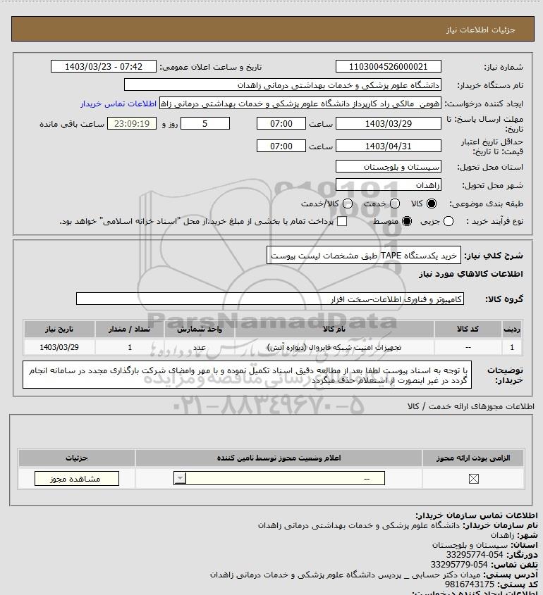 شرح کلی نیاز: خرید یکدستگاه TAPE طبق مشخصات لیست پیوست