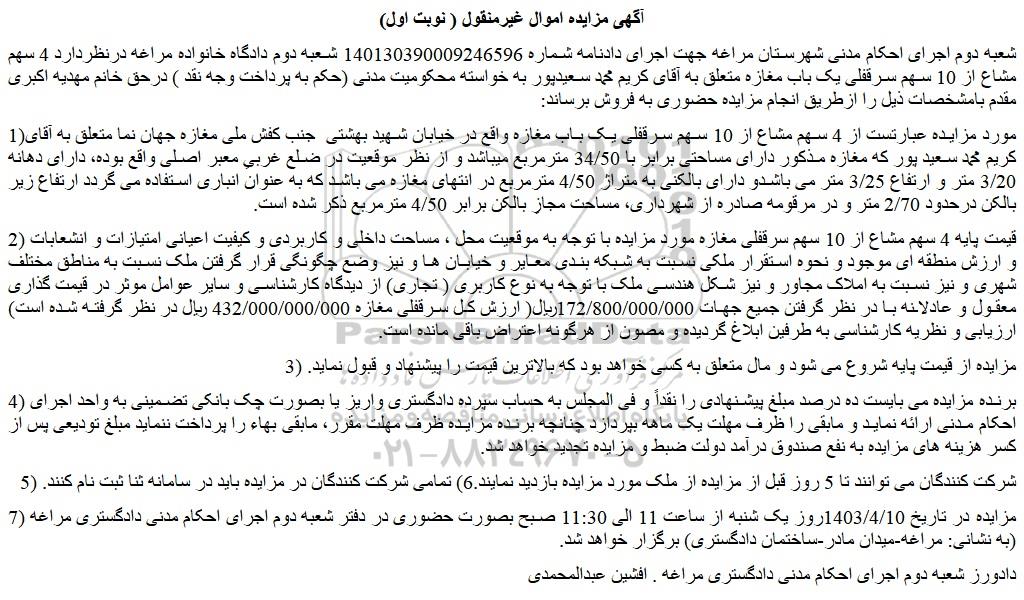 شعبه دوم اجرای احکام مدنی شهرستان مراغه جهت اجرای دادنامه شماره 140130390009246596 شعبه دوم دادگاه خانواده مراغه درنظردارد 4 سهم مشاع از 10 سهم سرقفلی یک باب مغازه متعلق به آقای کریم محمد سعیدپور به خواسته محکومیت مدنی (حکم به پرداخت وجه نقد ) درحق خانم مهدیه اکبری مقدم بامشخصات ذیل را ازطریق انجام مزایده حضوری به فروش برساند: