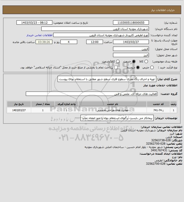 استعلام بها و موضوع استعلام استعلام تهیه و اجرای رنگ آمیزی سطوح فلزی سطح شهر مطابق با استعلام بهائ پیوست به اطلاع کلیه شرکتها و افراد متخصص واجد شرایط میرساند، آگهی گذار در نظر دارد از طریق استعلام بها، نسبت به انتخاب و دریافت پیشنهادات اقدام نماید. این استعلام با کد آگهی ثبت شده در سامانه خبرگزاری پارس نماد : 7582035 منتشر شده است. مشخصات استعلام : تاریخ شروع استعلام: 1403/03/23 آخرین مهلت ارسال پیشنهاد قیمت : 1403/03/27 و محل اجرای پروژه : استان قزوین میباشد. استعلام قیمت مورد درخواست : استعلام تهیه و اجرای رنگ آمیزی سطوح فلزی سطح شهر مطابق با استعلام بهائ پیوست با دستهبندیهای تخصصی و گروه های مرتبط : رنگ آمیزی, ساختمان, استعلام اطلاع رسانی میگردد.