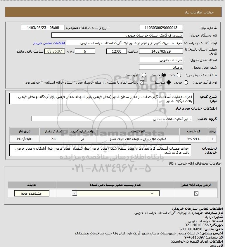 شرح کلی نیاز: اجرای عملیات آسفالت گرم تعدادی از معابر سطح شهر (معابر فرعی بلوار شهداء ،معابر فرعی بلوار آزادگان و معابر فرعی بافت مرکزی شهر