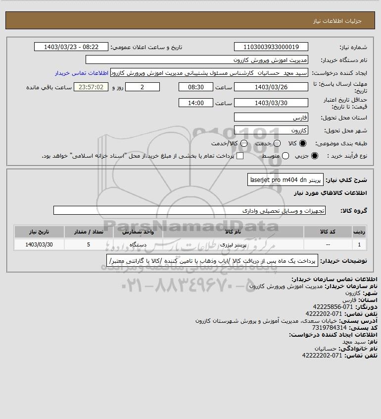 شرح کلی نیاز: پرینتر laserjet pro m404 dn
