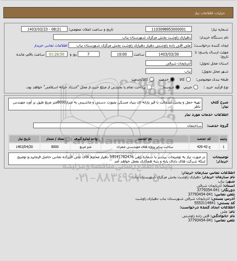 شرح کلی نیاز: تهیه حمل و پخش آسفالت با قیر یارانه ای بنیاد مسکن بصورت دستی و ماشینی به متراژ8000متر مربع طیق بر آورد مهندس ناظر