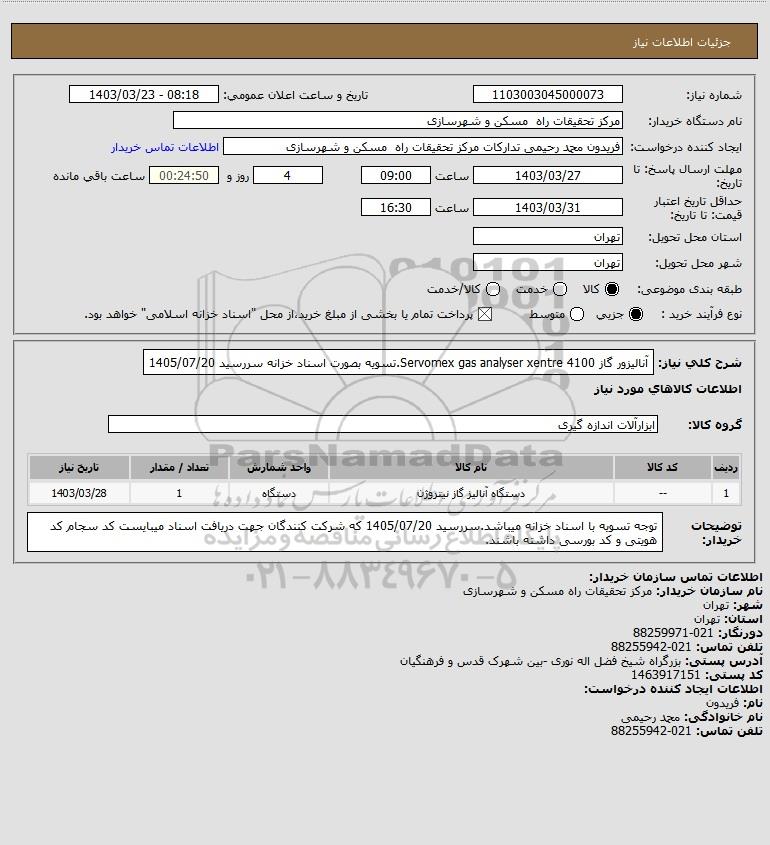 شرح کلی نیاز: آنالیزور گاز Servomex gas analyser xentre 4100.تسویه بصورت اسناد خزانه سررسید 1405/07/20
