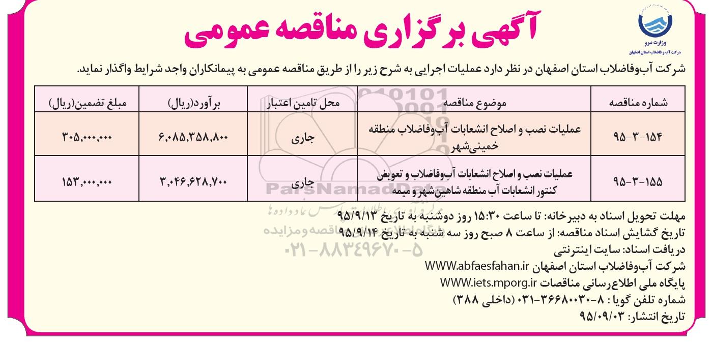 | 95-3-155 | عملیات نصب و اصلاح انشعابات آب و فاضلاب و تعویض کنتور انشعابات آب منطقه شاهین شهر و میمه |