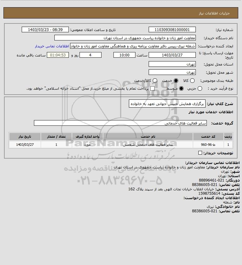 نام دستگاه خریدار:معاونت امور زنان و خانواده ریاست جمهوری در استان تهران