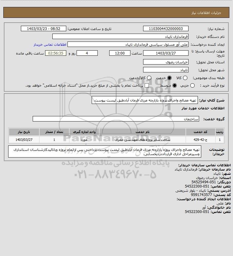 شرح کلی نیاز: تهیه مصالح واجرای پروژه بازارچه مرزی فرمان آبادطبق لیست پیوست.
