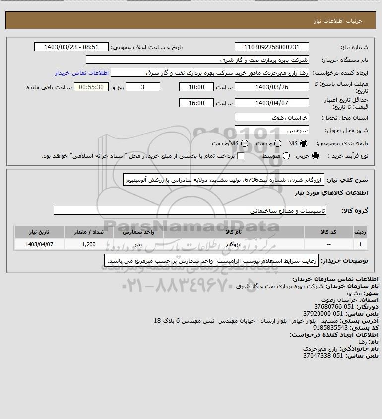 شرح کلی نیاز: ایزوگام شرق، شماره ثبت6736، تولید مشهد، دولایه صادراتی با روکش آلومینیوم