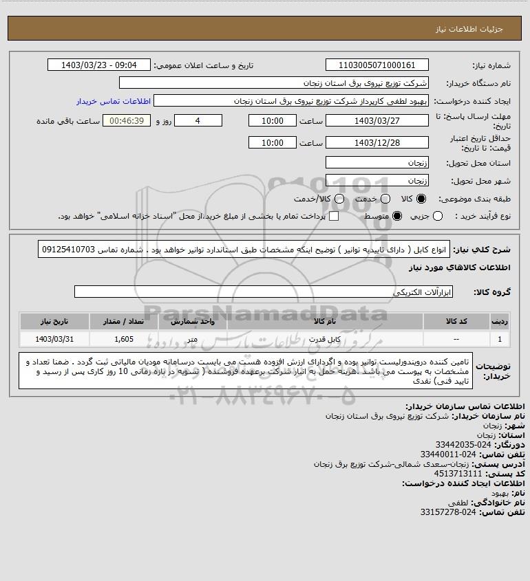 شرح کلی نیاز: انواع کابل ( دارای تاییدیه توانیر ) توضیح اینکه مشخصات طبق استاندارد توانیر خواهد بود . شماره تماس 09125410703