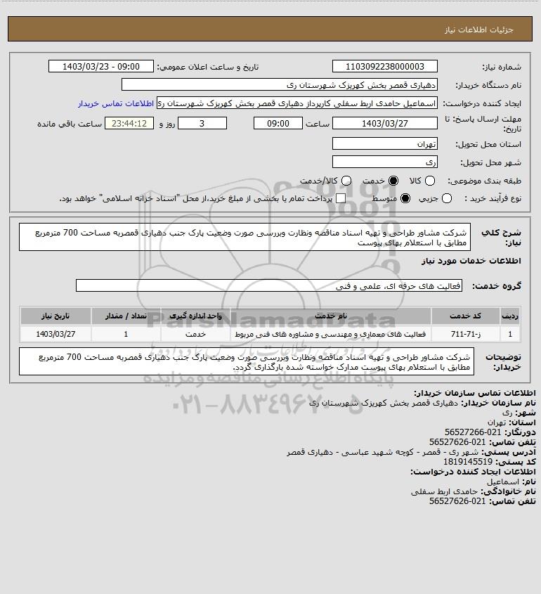 توضیحات خریدار:شرکت مشاور طراحی و تهیه اسناد مناقصه ونظارت وبررسی صورت وضعیت پارک جنب دهیاری قمصربه مساحت 700 مترمربع مطابق با استعلام بهای پیوست مدارک خواسته شده بارگذاری گردد.