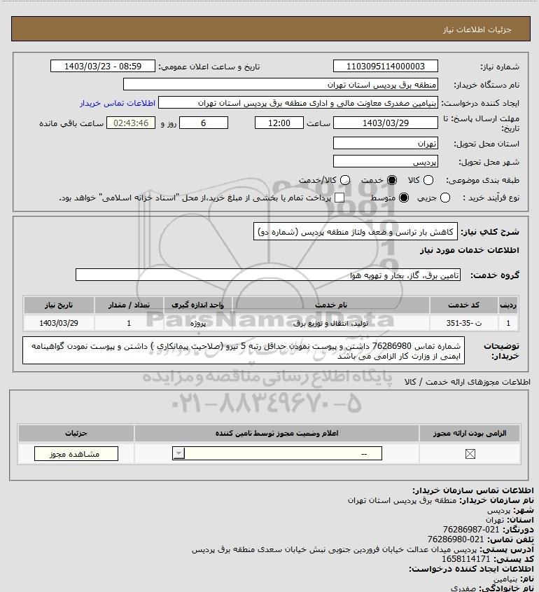 شرح کلی نیاز: کاهش بار ترانس و ضعف ولتاژ منطقه پردیس (شماره دو)