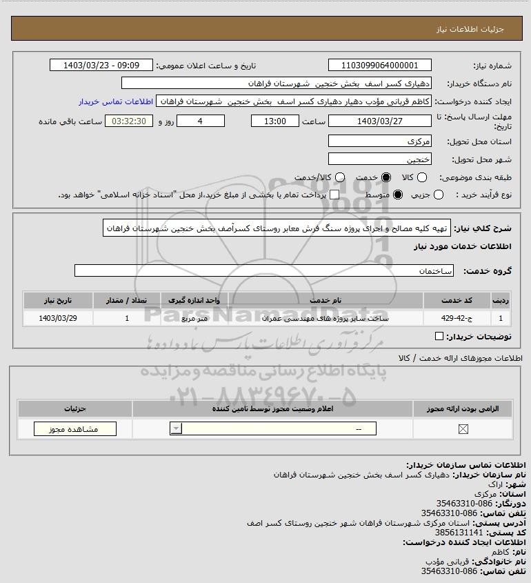 شرح کلی نیاز: تهیه کلیه مصالح و اجرای پروژه سنگ فرش معابر روستای کسرآصف بخش خنجین شهرستان فراهان