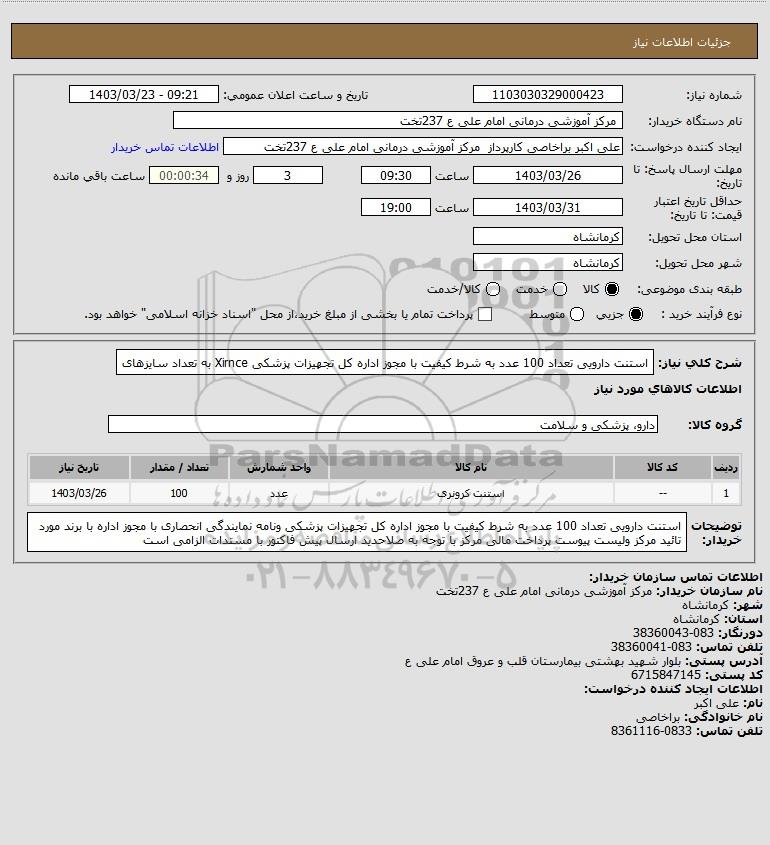 شرح کلی نیاز: استنت دارویی تعداد 100 عدد به شرط کیفیت با مجوز اداره کل تجهیزات پزشکی Xirnce به تعداد سایزهای