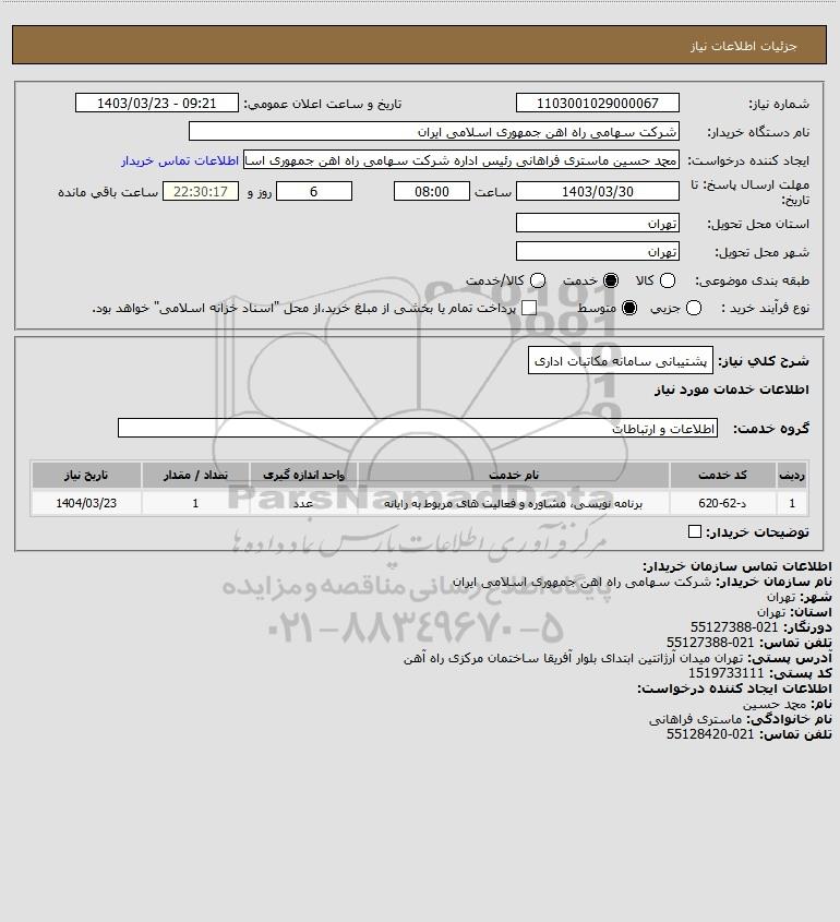شرح کلی نیاز: پشتیبانی سامانه مکاتبات اداری